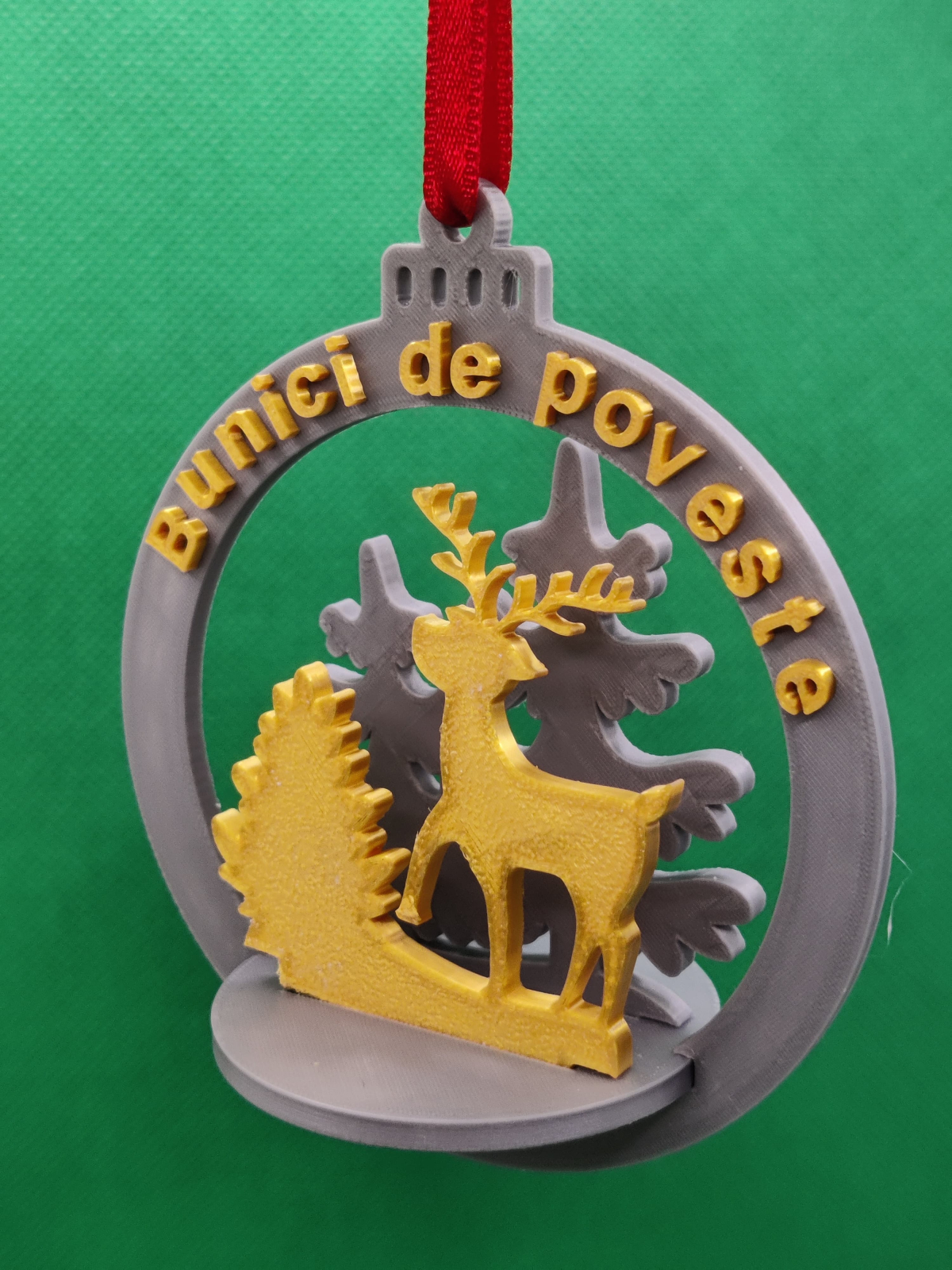 Decorațiunea 3D, are elemente suprapuse pentru un efect vizual de poveste, avand ca tematică “iarna” (cerb, brazi și peisaj forestier). Prezintă formă de glob de Crăciun personalizată cu textul „Bunici de poveste” armonizat de eleganța culorilor gri-auriu metalizat ( culorile pot varia în funcție de preferințe).