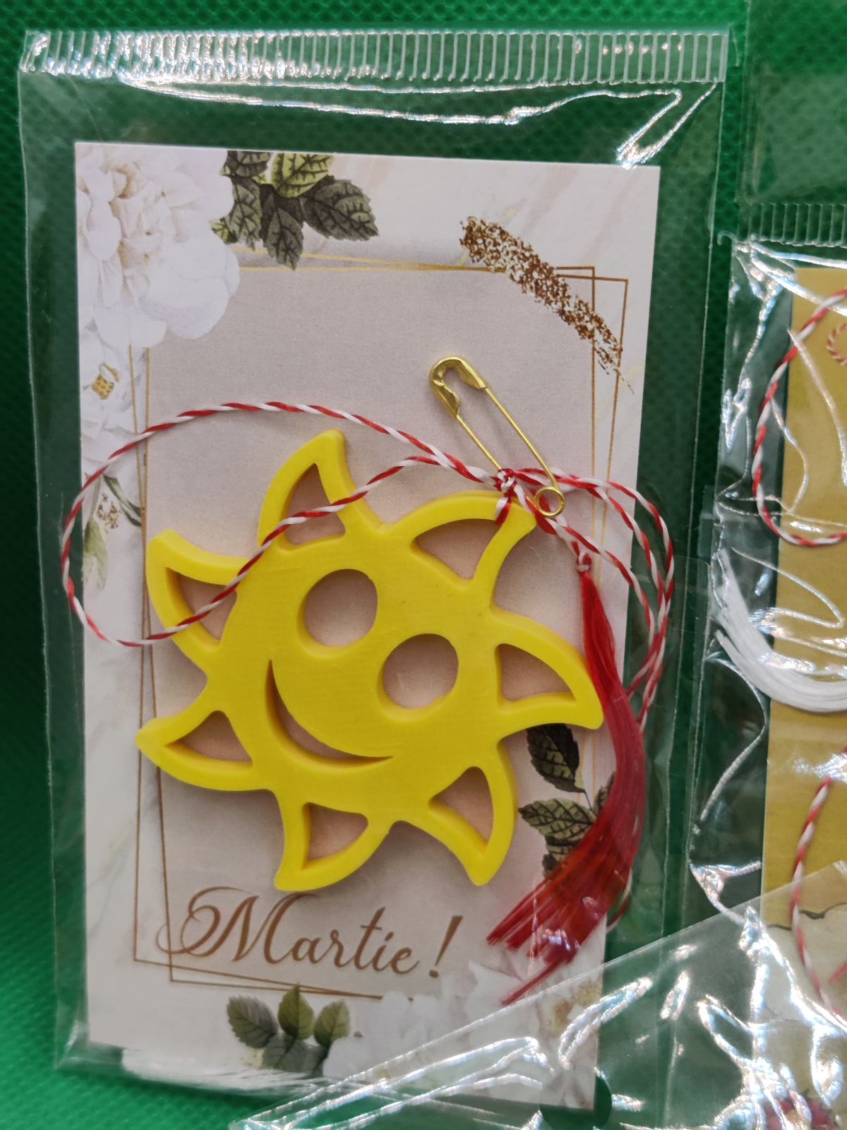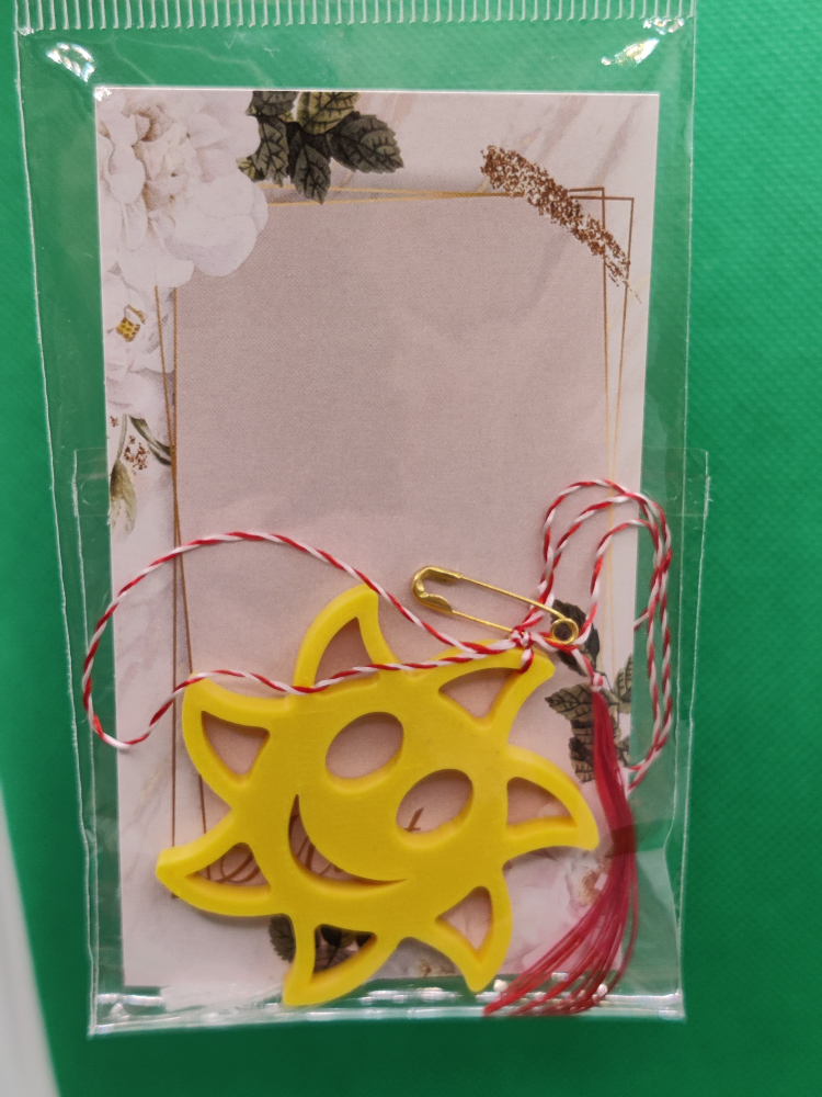 Acest mărțișor cu design de soare zâmbitor este alegerea perfectă pentru cei care vor să ofere un dar plin de optimism și energie pozitivă. Realizat dintr-un material ușor și plăcut la atingere, mărțișorul are un aspect vesel și un chip prietenos, ideal pentru a însenina ziua persoanelor dragi. Fiecare mărțișor este ambalat individual într-o folie transparentă, pe un carton decorativ cu motive florale, ceea ce îl face gata de oferit fără nicio pregătire suplimentară. Este prevăzut cu șnur tradițional alb‑roșu, ciucure roșu și ac de prindere, astfel încât poate fi purtat imediat.
