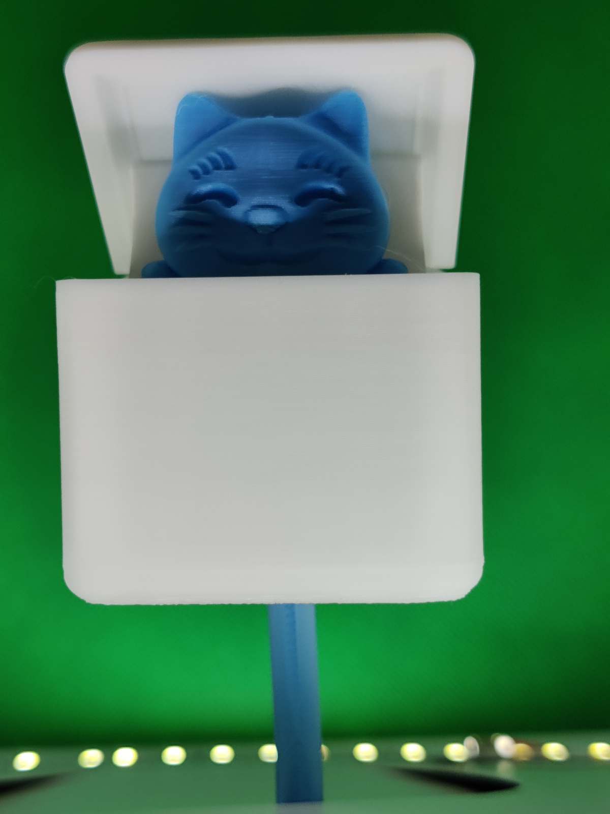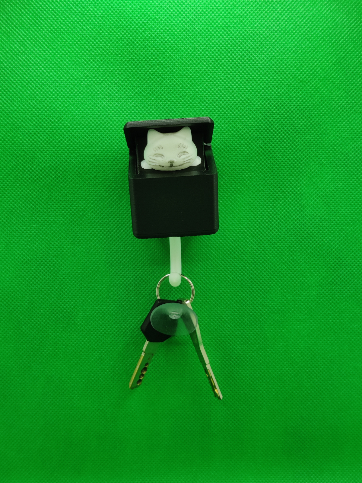 Adaugă un strop de veselie și originalitate organizării tale cu acest suport pentru chei imprimat 3D, în formă de pisicuță. Designul său unic include o cutiuță neagră din care iese o pisicuță albă, cu un zâmbet simpatic și ochi închiși, oferind o notă jucăușă și prietenoasă.